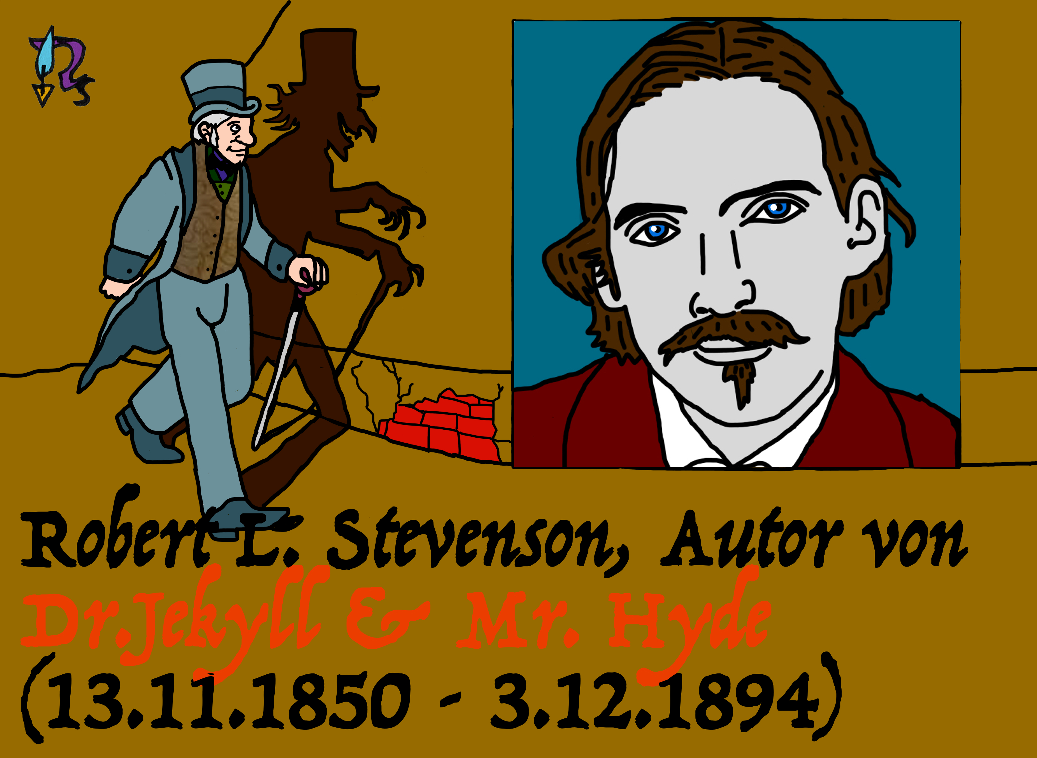 Dieses Bild widme ich heute dem schottischen Autor Robert Louis Stevenson, dem Autor des Schauerromans “Dr. Jekyll & Mr. Hyde“. Bis heute ist seine Figur Mr. Hyde ungeheuer populär. Das Doppelgänger -Motiv ist so präsent wie nie zuvor. Gerade bei Superhelden-Filmen und Mystery Novellen.